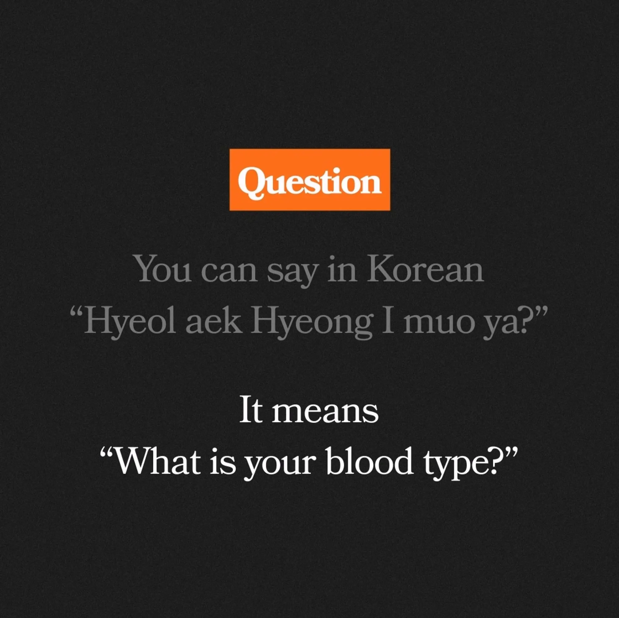 However, it is still a frequently asked question. If you meet a Korean who is interested, you’d better practice asking, "Hyeol aek Hyeong I muo ya?" which means "What is your blood type?"