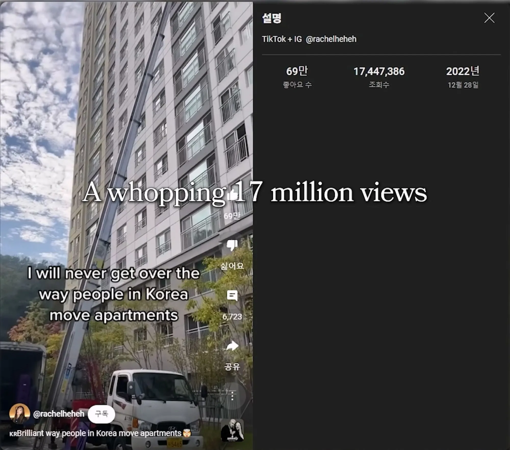 A global sensation, the Korean moving method using ladder trucks has garnered 17 million views and 690,000 likes on YouTube. This moving method, which became a hot topic worldwide, showcases the unique and efficient way Koreans handle moving.