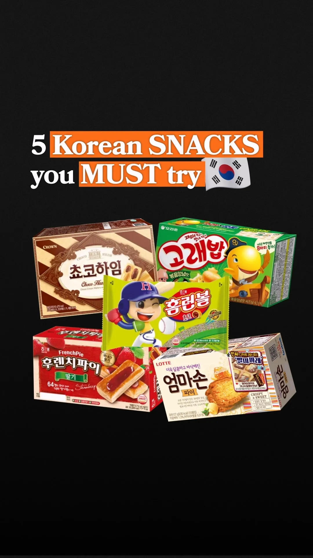 Keywords: Korean snacks, French Pie, Whale Rice, Homerun Ball, Mother Hand Pie, Choco Heim, Korean treats, savory cookies, chocolate wafers, seafood snacks, snack gifts.