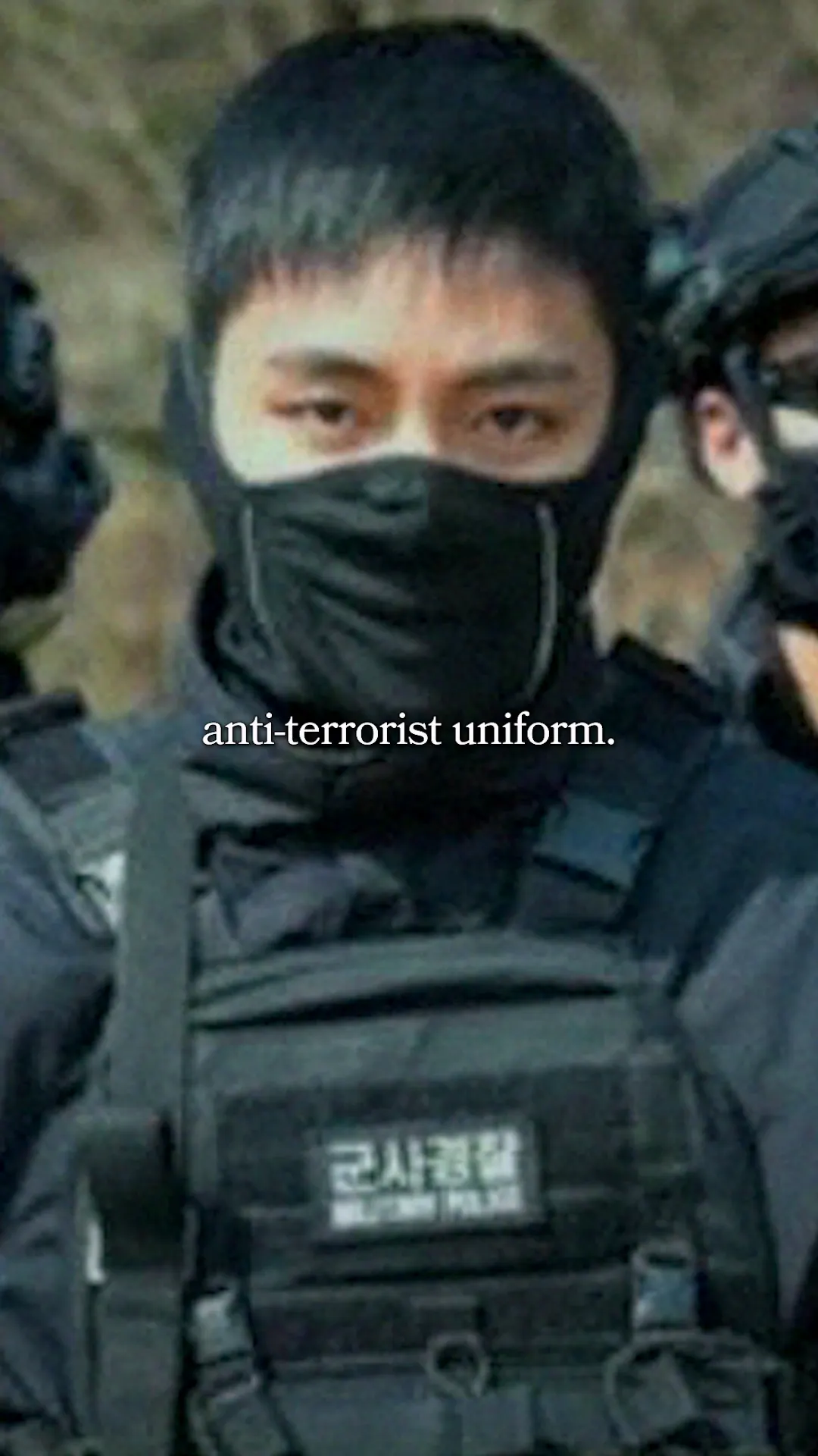 BTS V, military police, anti-terrorist uniform, intense gaze, handsome appearance, movie filming, Korean military service, SDT organization, counter-terrorism operations, special operations, Bangtan, blocking flying bullets, dedication, versatility, pop star, military service, young men in Korea, serving the country, responsible individuals, resilient individuals.
