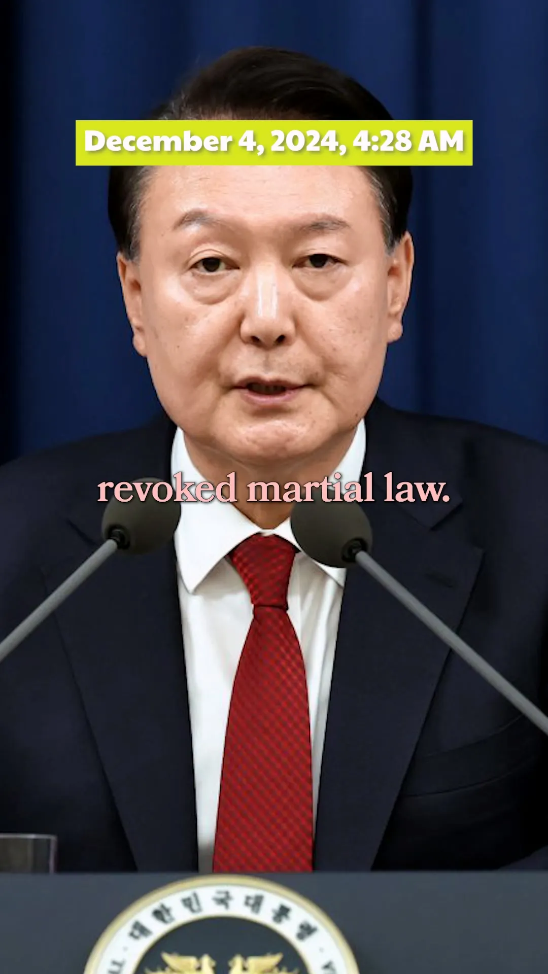 On December 3, 2024, at precisely 10:28 PM, President Yoon shocked the nation by declaring martial law. The announcement came amidst heightened political tensions, with the government citing severe disruptions caused by the opposition's budget cuts and allegations of electoral fraud.